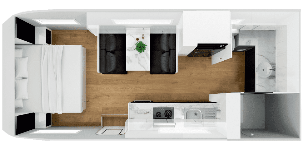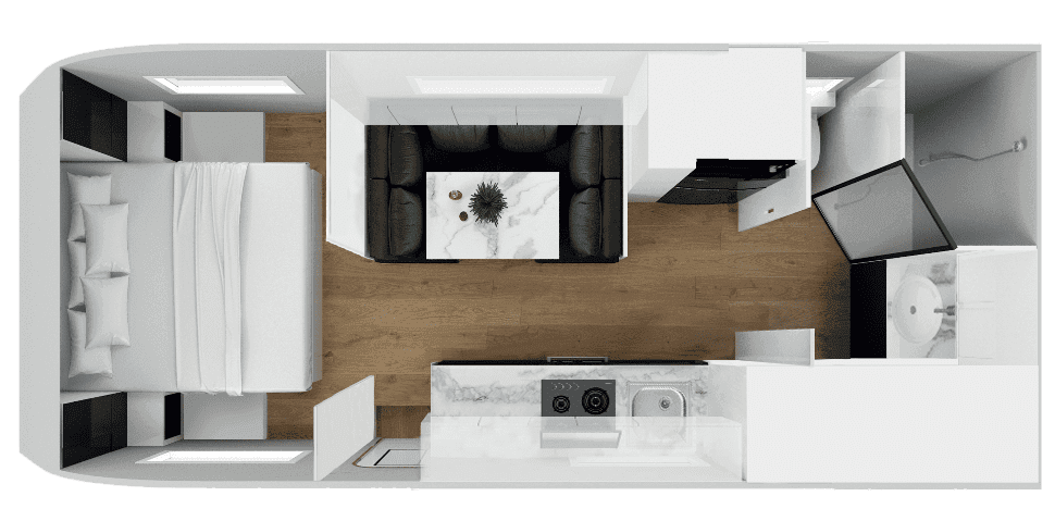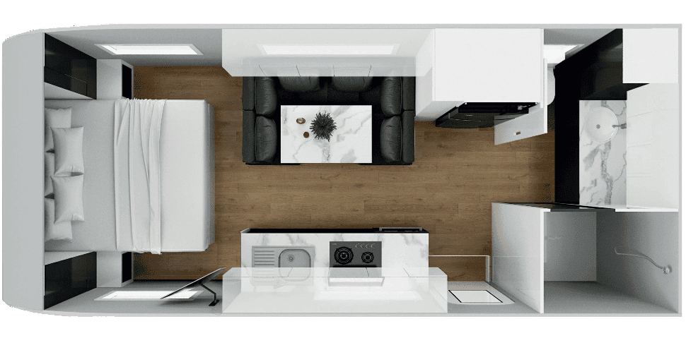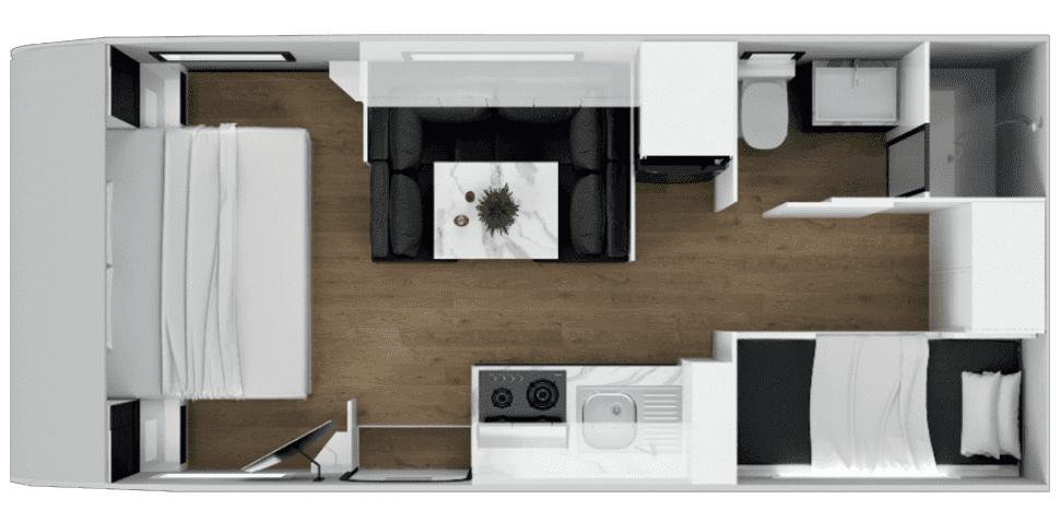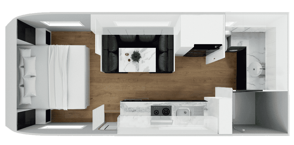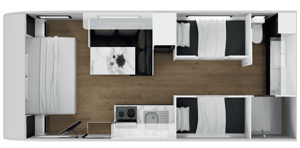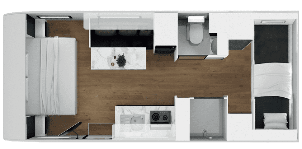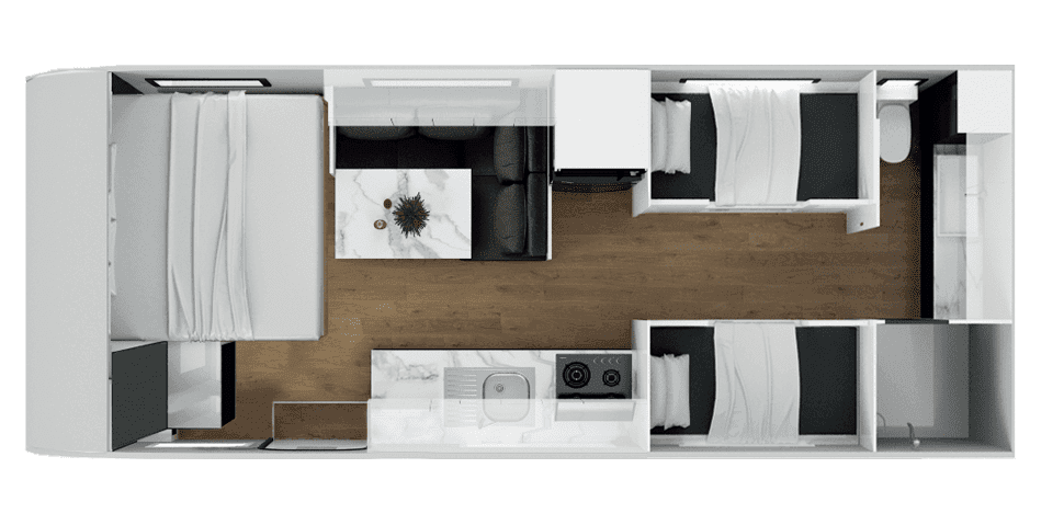 The Optimum Director’s Edition is built to conquer Australia’s toughest terrains. Its custom-designed chassis is crafted from 450-grade zinc-galvanized Australian steel and features a heavy-duty truss design with Raptor coating. The TerraGlide 4.5T rated independent airbag suspension with wireless remote ensures a smooth ride over uneven surfaces. The caravan is equipped with 17” alloy wheels, Mickey Thompson 265/70/R17 tyres, and a DO-45 off-road coupling for enhanced durability. Additional exterior features include a mesh stone deflector, rear bumper with jerry can holders and firewood compartment, and a pull-out tray for added convenience. Designed for the adventurous traveler, the Optimum is ready to take on any challenge.