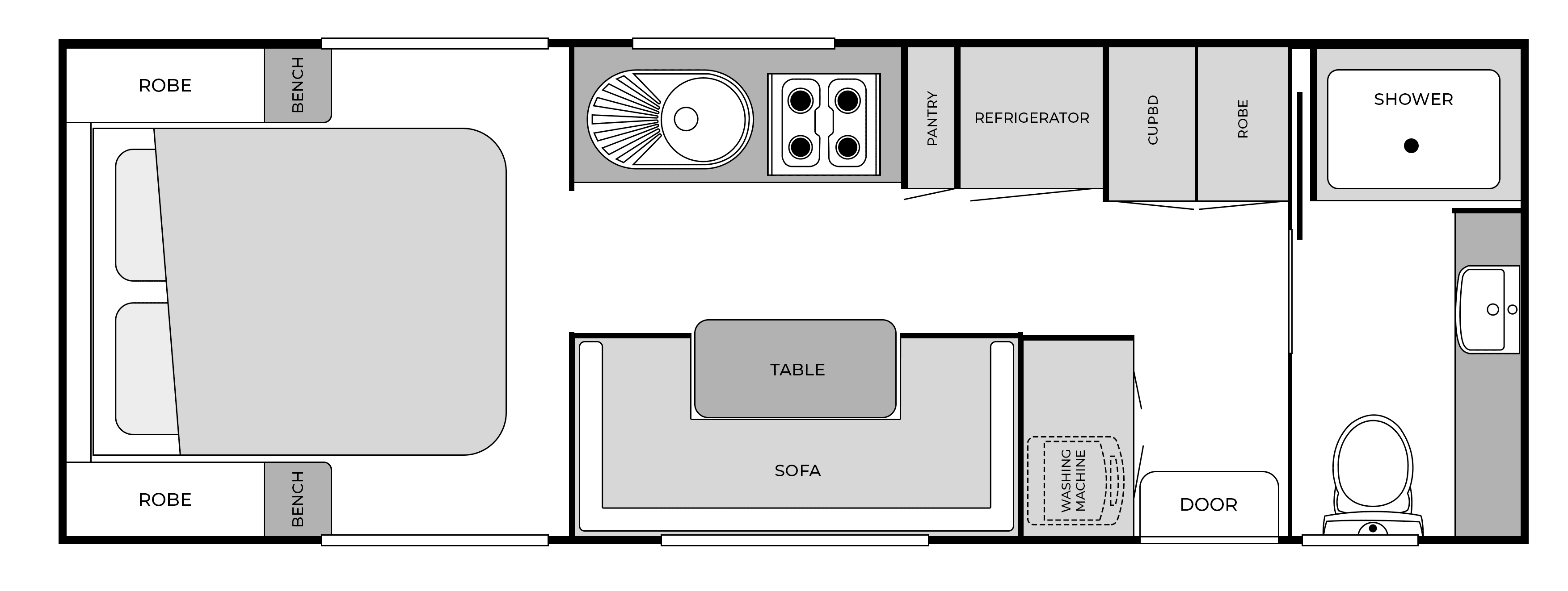 Lastly, the queen-sized bed is positioned at the farthest end of the van, directly opposite the ensuite, providing a private and serene retreat within your caravan. Designed with solo or duo travellers in mind, this model offers the utmost spaciousness among our range, enhancing your comfort and enjoyment on the road.