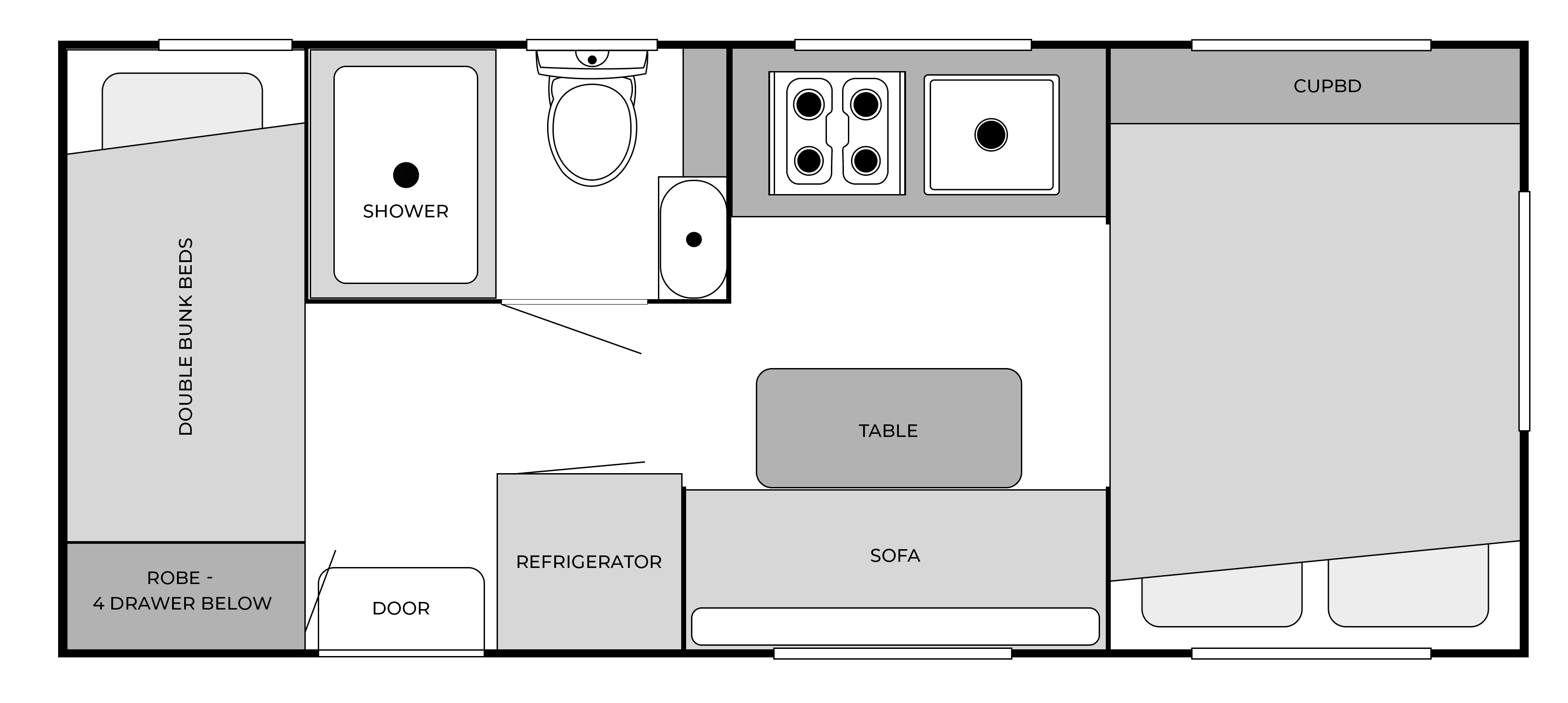 In this caravan, we’ve strategically arranged the bunk beds and the main bed at opposite ends. As you step through the door, you’ll find the bunk beds to your left, with the full ensuite conveniently situated right in front of you, adjacent to the kitchen. Pivot a little bit from the kitchen, you’ll encounter the inviting dining area.